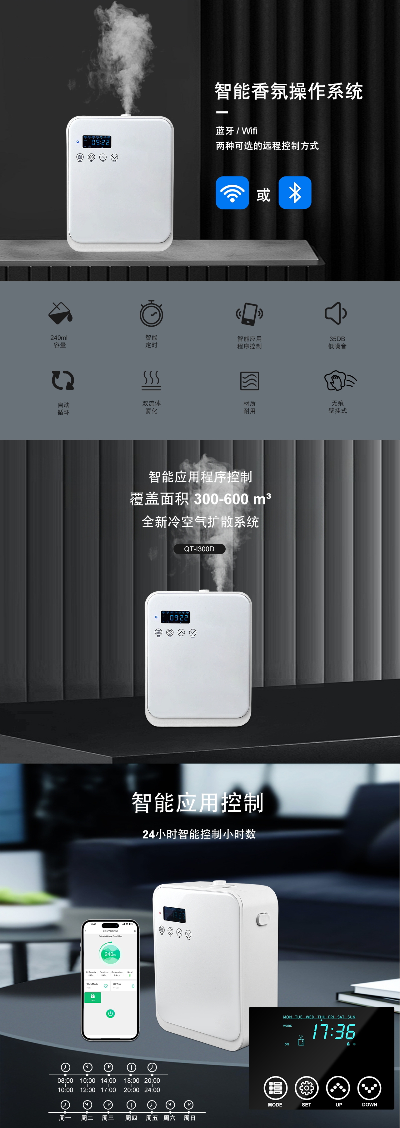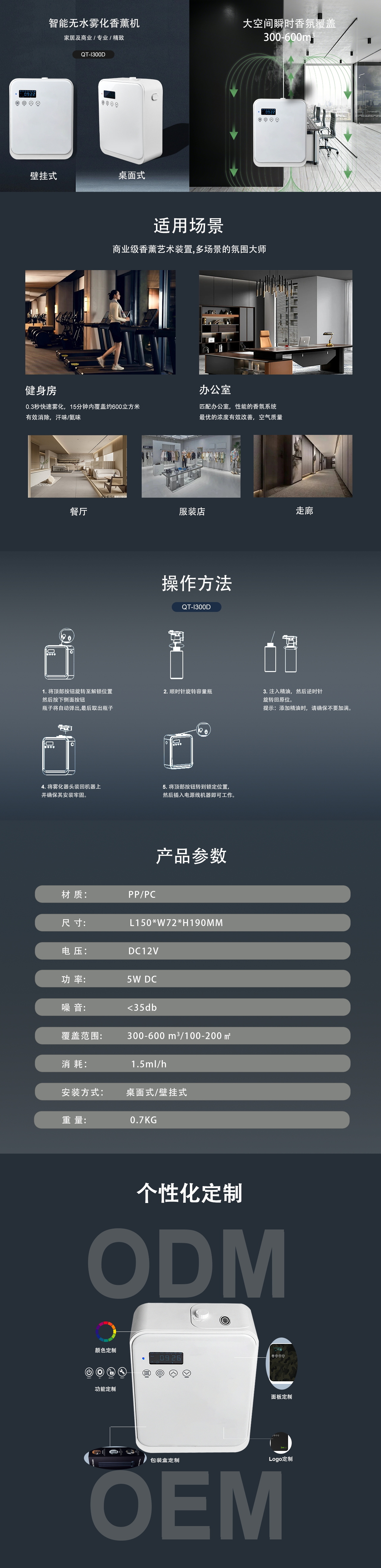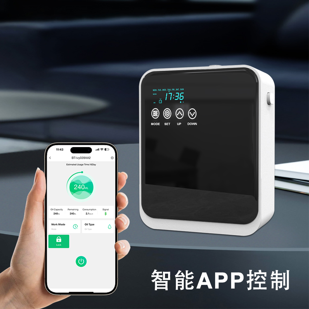QT-I300智能香薰系统专为100-300㎡品质空间设计,240ml精油瓶支持长时间持续扩香,无需加水,支持蓝牙APP远程控制。机身采用PP/PC工程塑料,耐热耐用,可桌面摆放或壁挂安装,兼具实用性与现代美感。融合德国双流体雾化科技与物联网控制,满足三大核心场景: