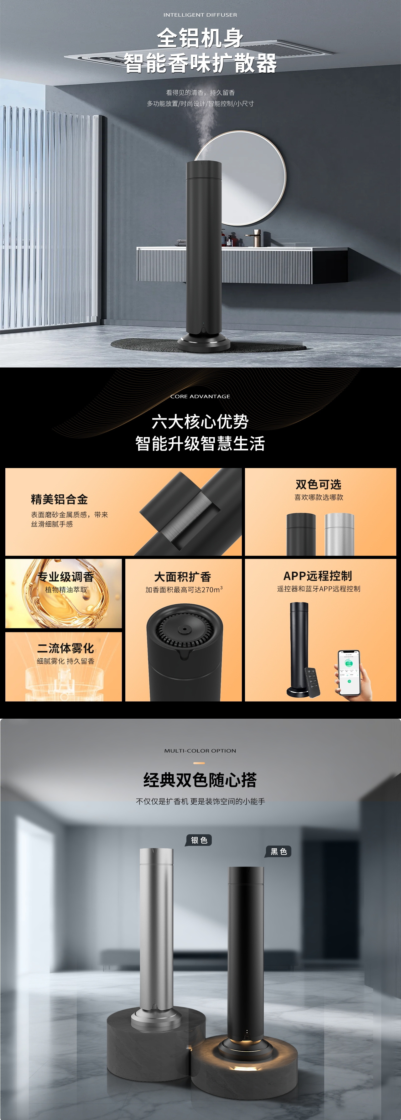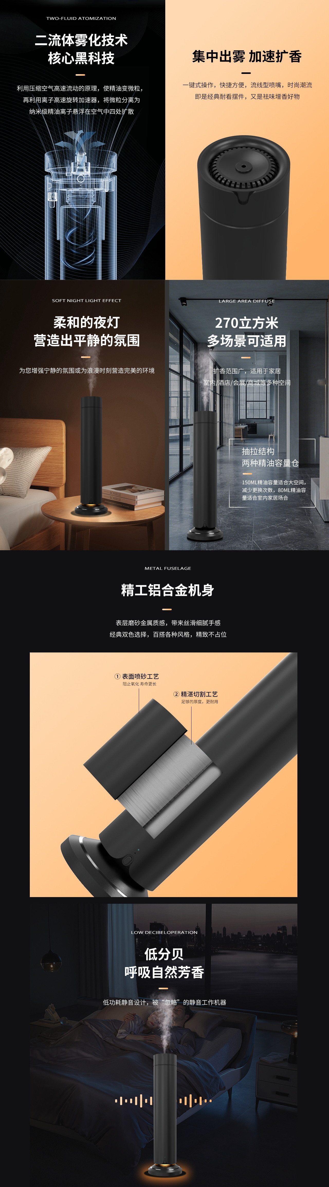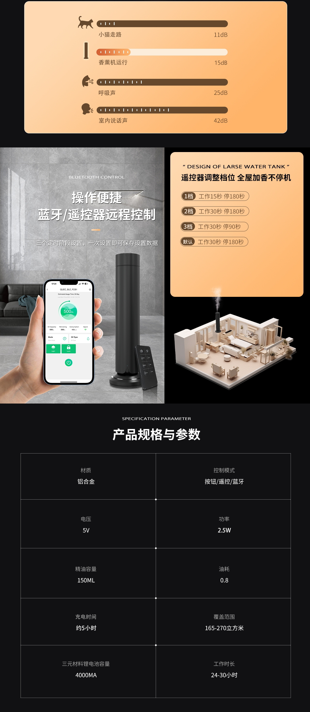 QT-V202无线夜灯智能扩香系统专为83–111㎡中大空间设计,支持150ml与80ml精油瓶自由切换,适配不同应用场景。内置4000mAh电池实现24–30小时无线运行,支持蓝牙APP及遥控控制,搭配柔和夜灯,为香氛体验增添氛围感。选用高品质铝合金机身,结合德国双流体冷雾雾化技术,实现无水扩香、静音运行,广泛适用于酒店、养生、零售、高端住宅等空间。