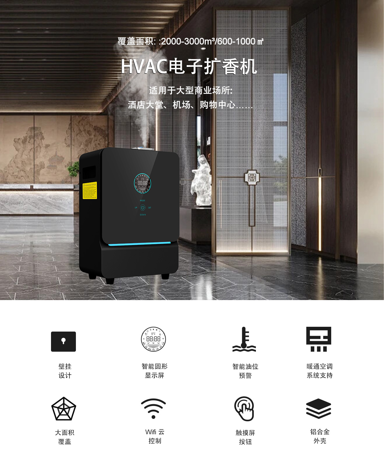 QT-Y3000D 是一款面向大面积商业空间的高性能 HVAC 香氛设备,专为酒店大堂、写字楼、商场、机场及大型公共区域设计开发。设备支持 WiFi 远程智能控制,搭载高效雾化系统,持续输出细腻稳定的香气,能够有效提升空间体验与品牌氛围感。