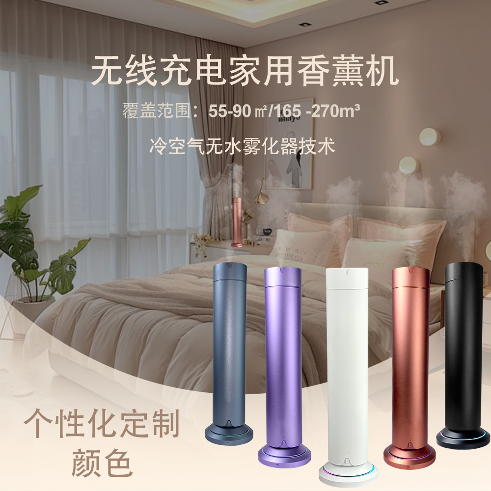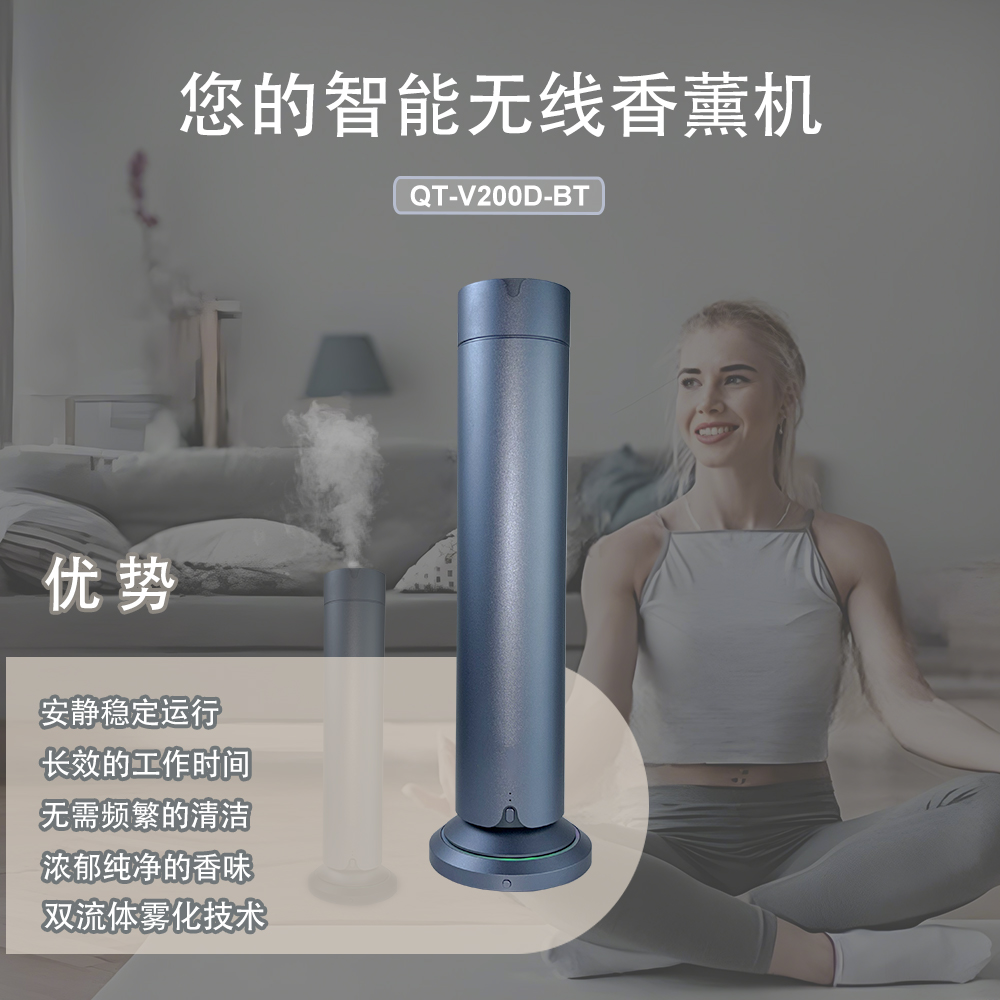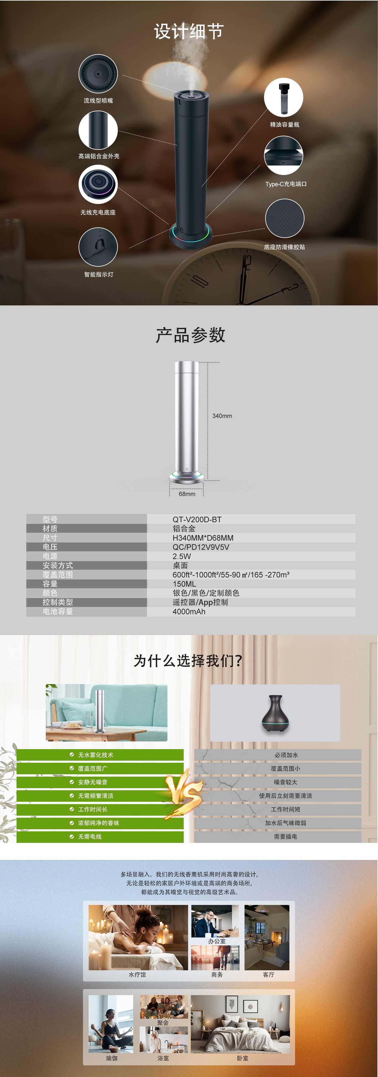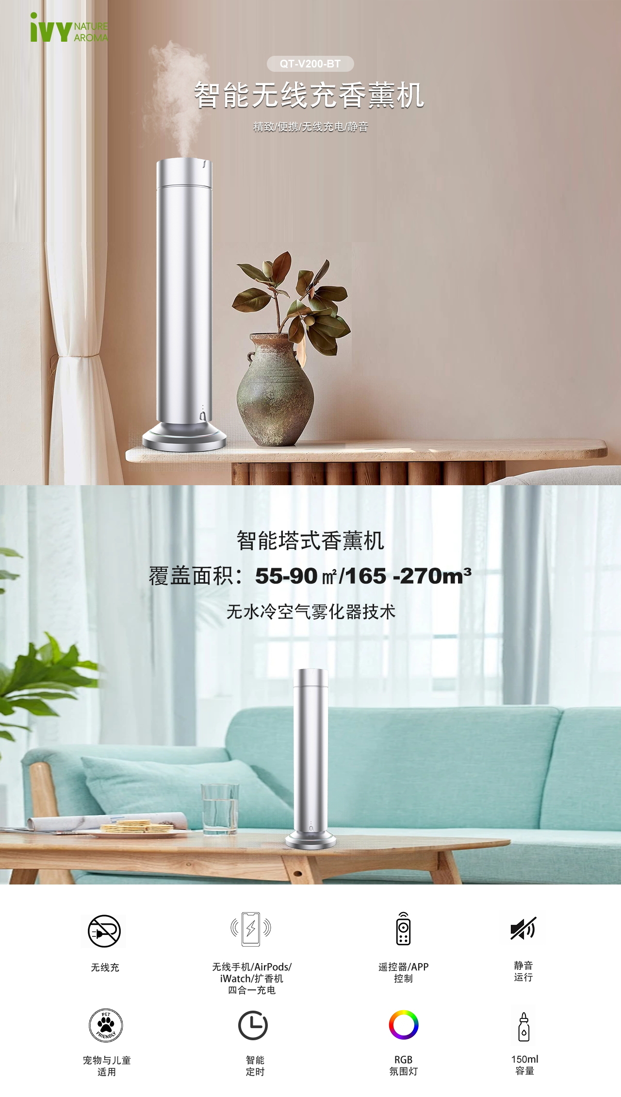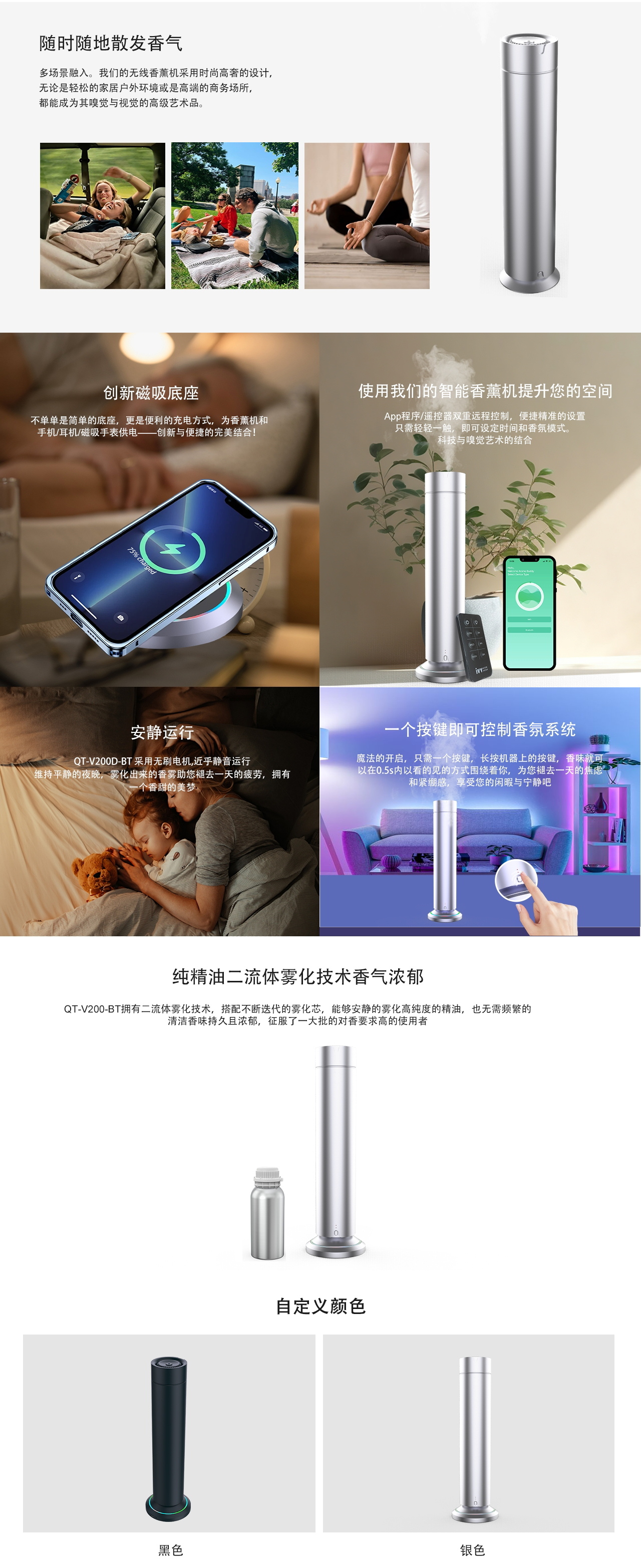 QT-V200 三合一无线扩香机将香薰扩散、无线充电与氛围灯功能集于一体,是一款兼顾实用性能与空间美学的多功能设备。机身外壳采用阳极氧化铝合金,触感细腻,结构坚固,既具科技质感,又兼容多种家居与商务空间风格。