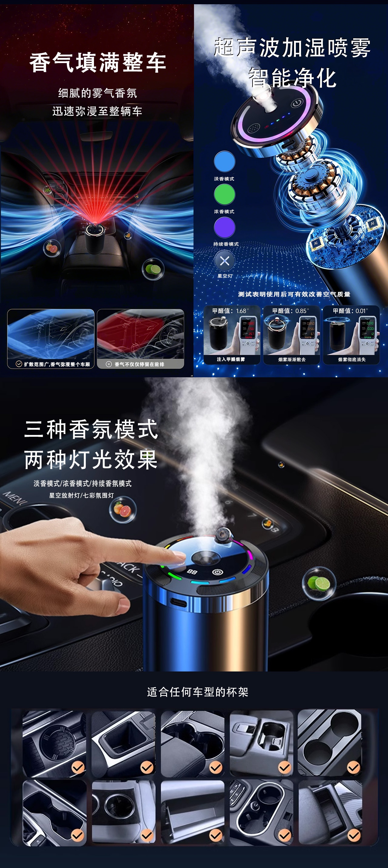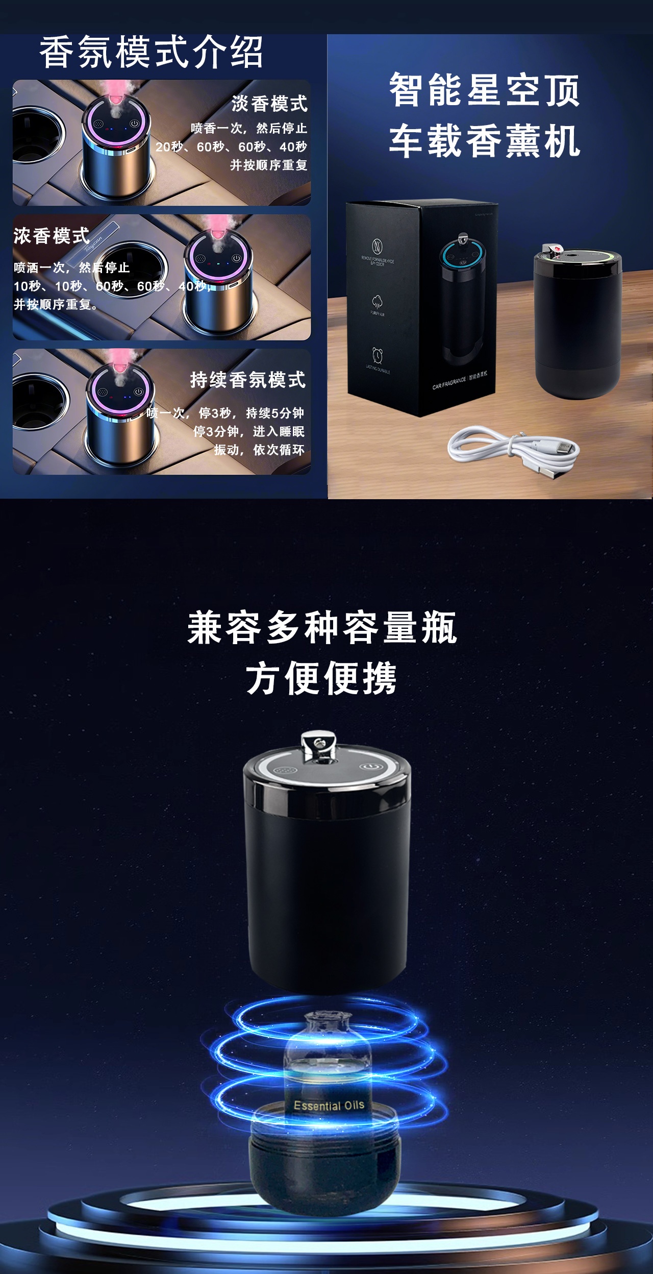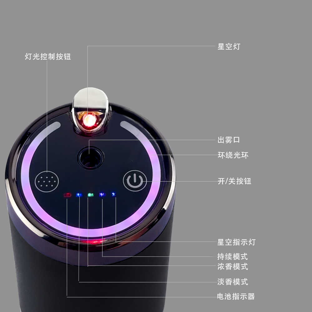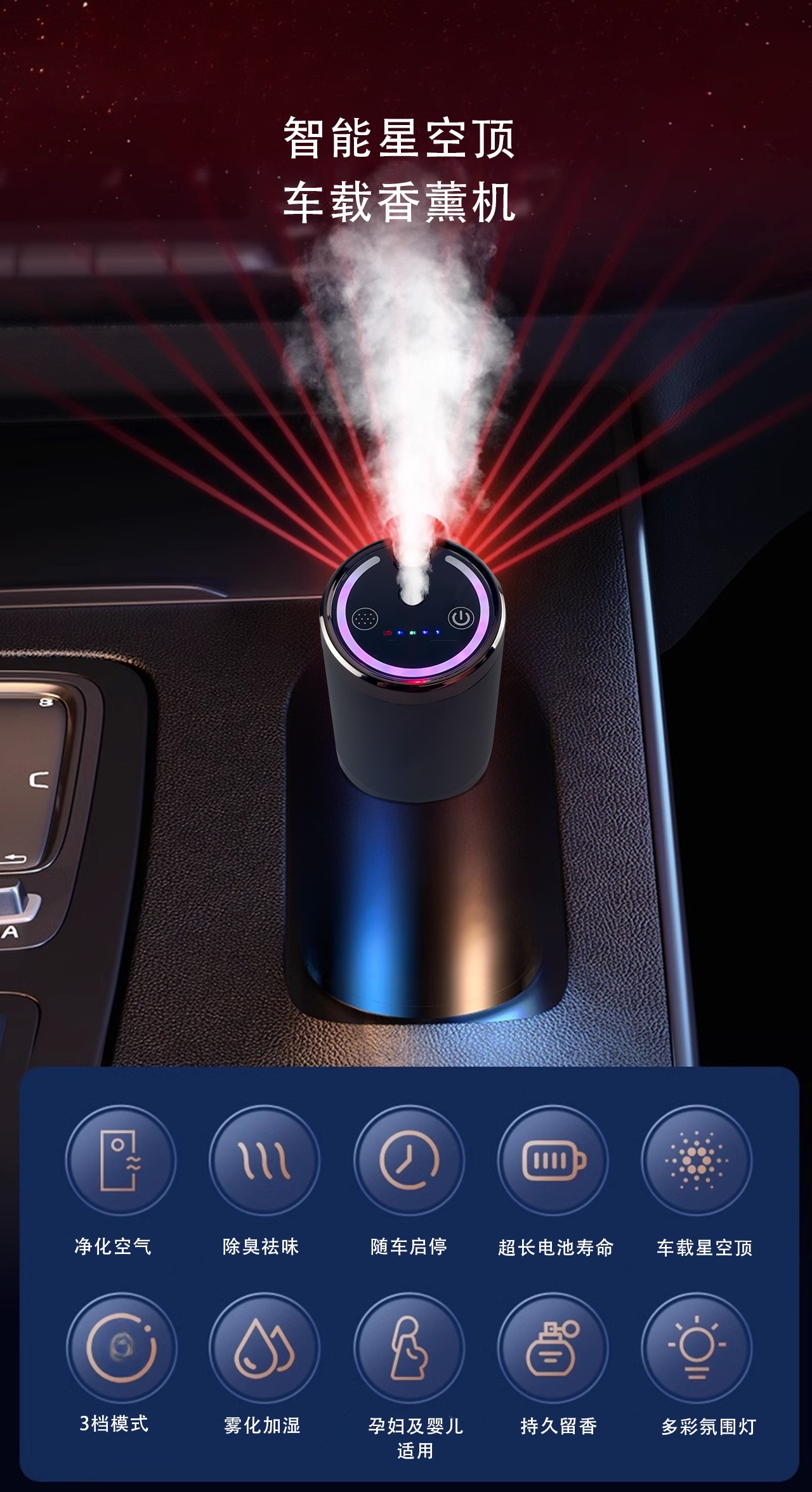 这款车载香薰机集香氛扩散、氛围灯投影与智能启停于一体,采用超声波冷雾雾化技术与7色星空灯光投影设计,带来浪漫氛围与空气清新双重享受。智能红外感应支持上车自动开启,下车自动关闭,操作便捷,是车饰品牌、电商礼盒组合、OEM定制渠道的优质选项。
