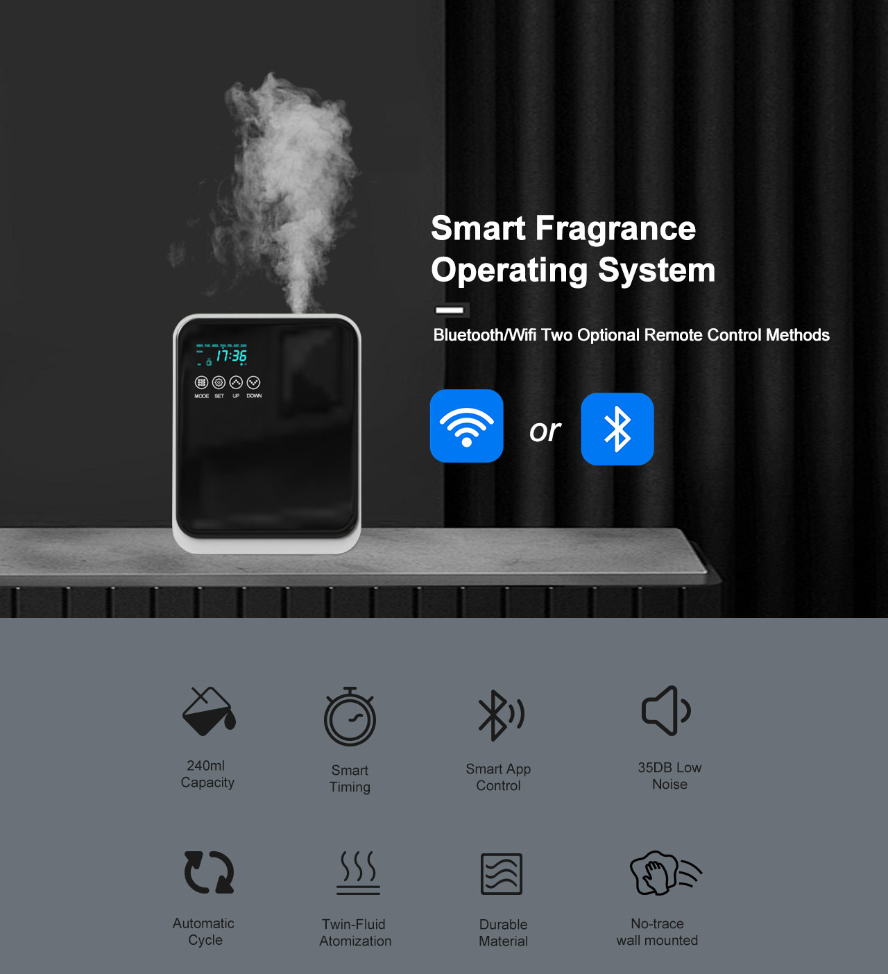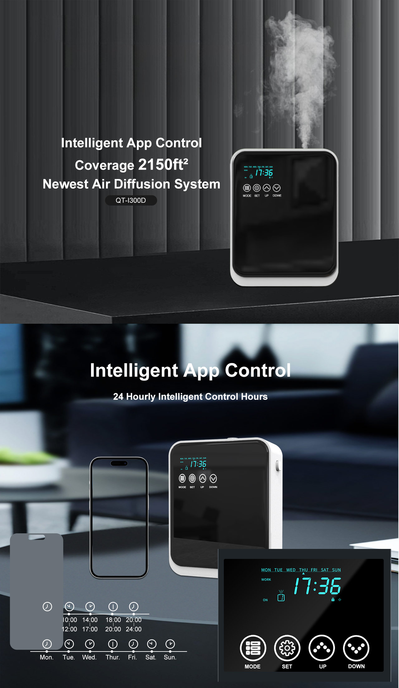 QT-I300 smart aroma diffuser is built for medium-sized spaces such as offices, spas ,hotel rooms, wellness studios, and open-plan living areas. With a generous 240ml capacity, efficient twin-fluid atomization, and Bluetooth app control, it delivers long-lasting, ultra-quiet fragrance with waterless. The durable PP/PC body and wall-mount/tabletop flexibility make it both practical and stylish.