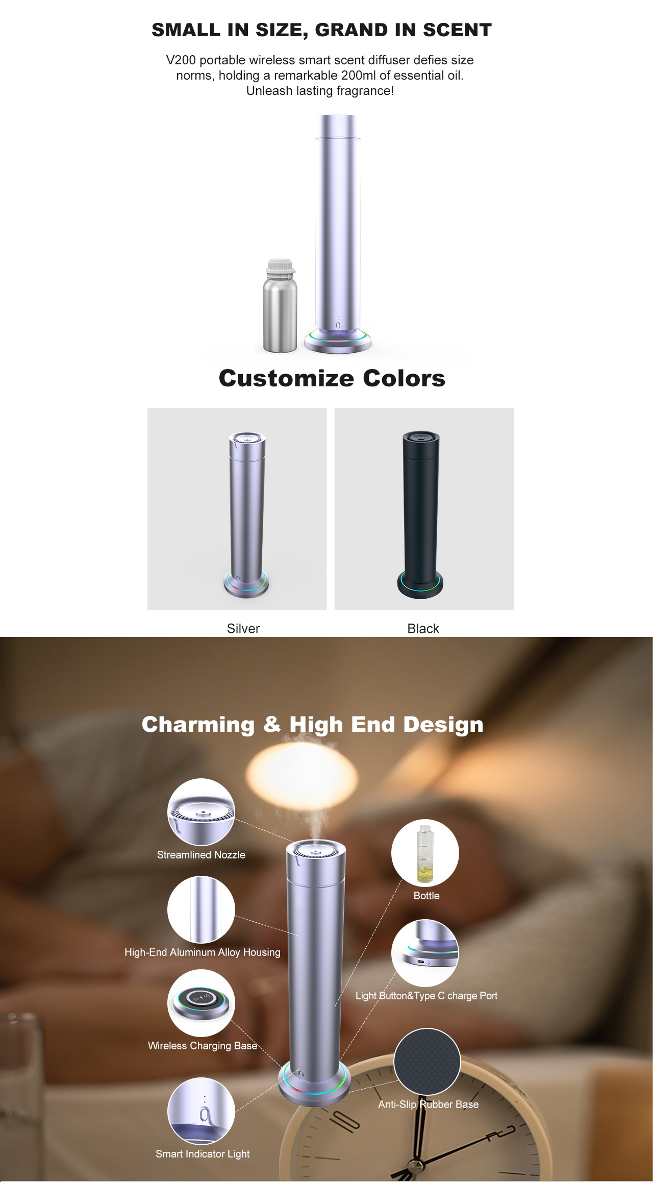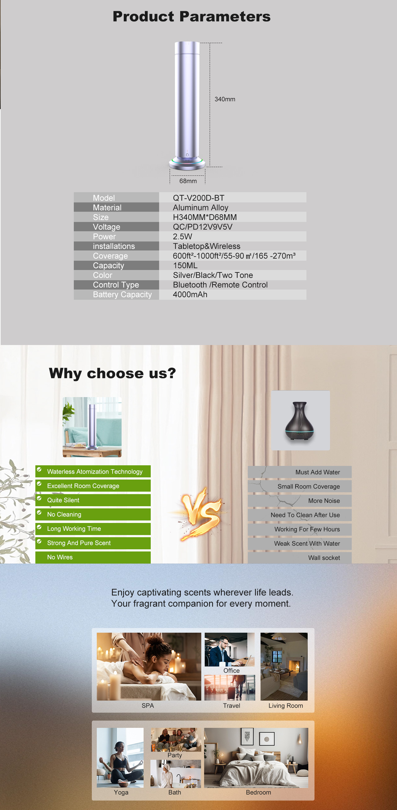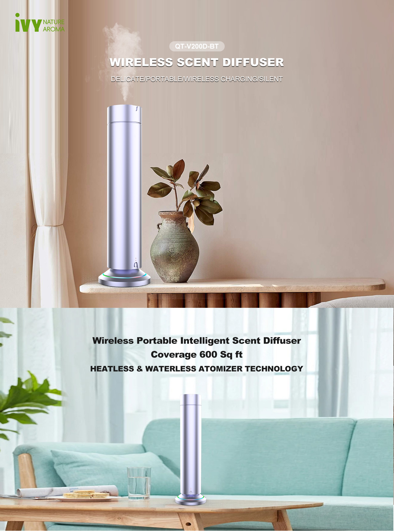 QT-V200 premium wireless phone charging aroma diffuser blends high-end metal aesthetics with smart fragrance control and integrated QI wireless charging. Designed for modern interiors, it offers remote app control, silent atomization, and compatibility with iPhone, AirPods, and Apple Watch. A powerful two-fluid atomizer, 4000mAh battery, and up to 30 hours of cordless runtime make it ideal for offices, bedrooms, spas, and boutique retail spaces.