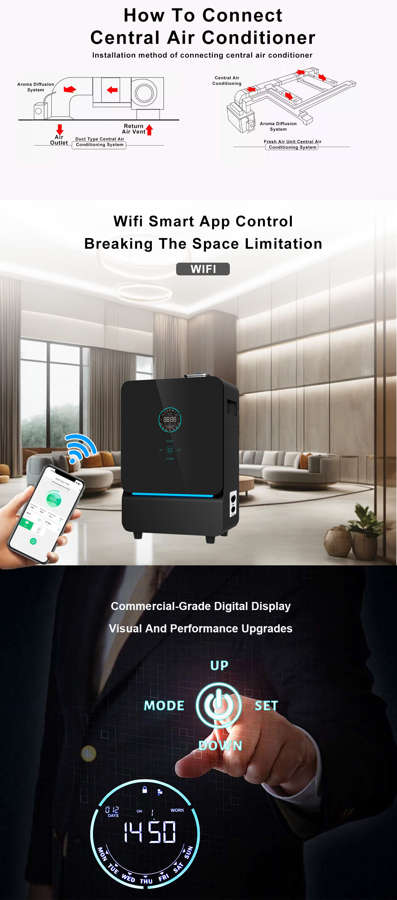 · WiFi App Control + Smart Display – Remotely manage scent schedules and monitor status