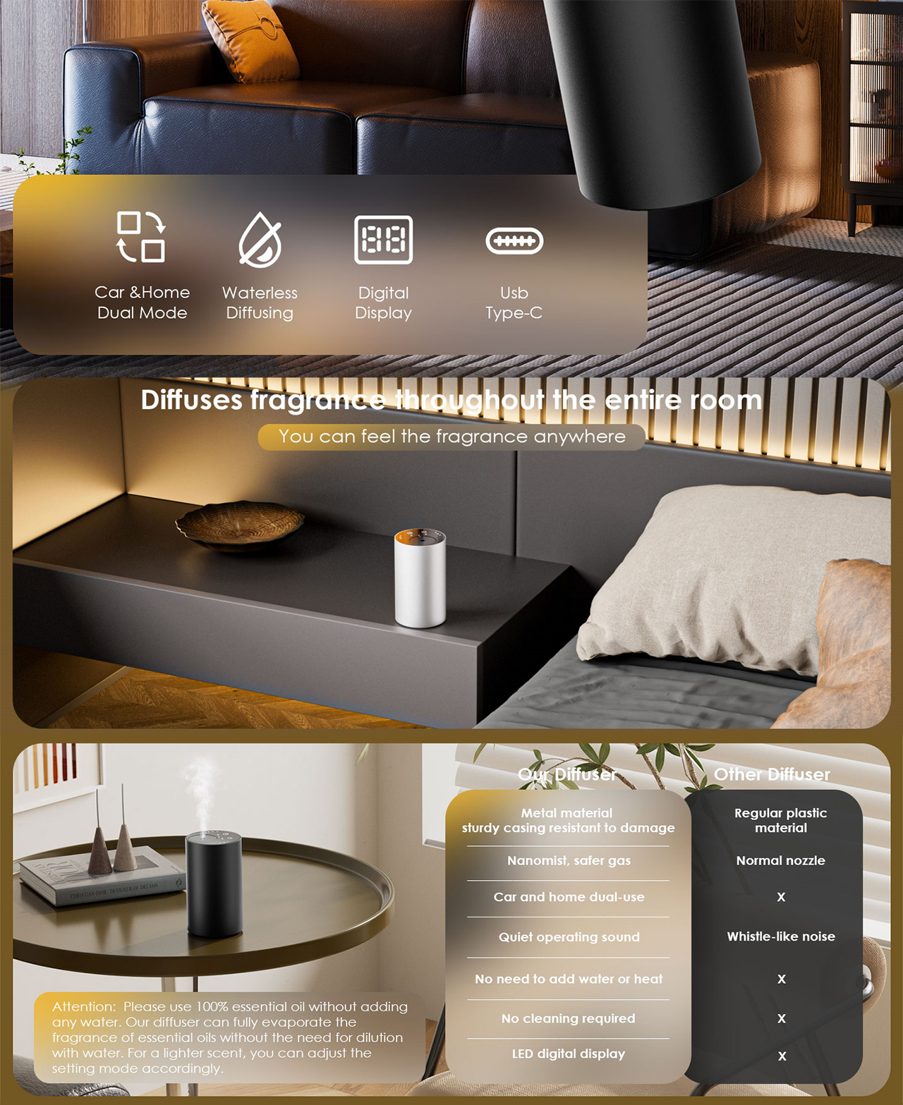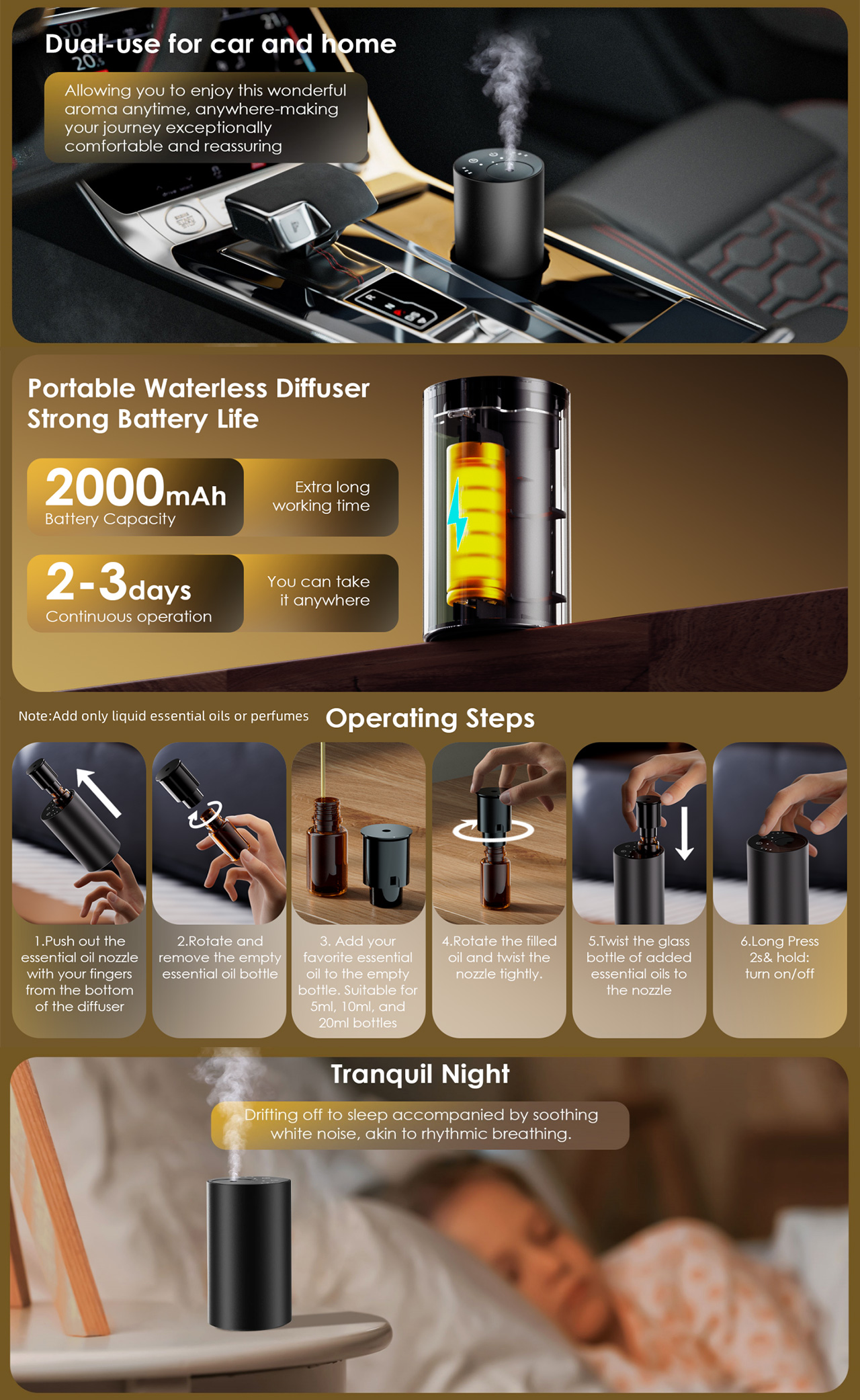 Designed for dual use in vehicles and indoor spaces, our Home & Car Wireless Aroma Diffuser offers a clean, waterless nano mist experience with zero heat, zero dilution, and zero spills. This high-end diffuser combines aluminum alloy craftsmanship, cordless convenience, and advanced scent technology, making it the preferred choice for distributors, retailers, and fragrance brands seeking quality and versatility.